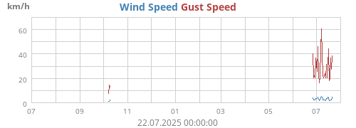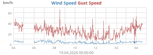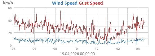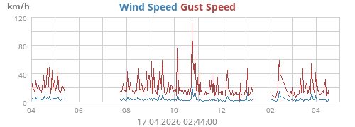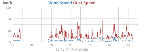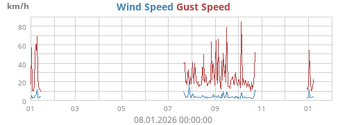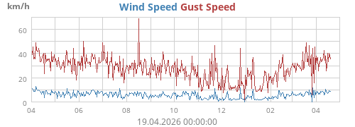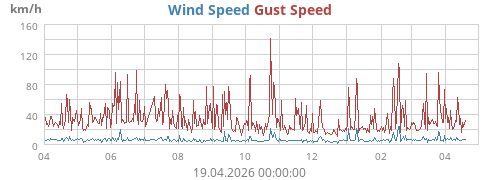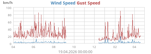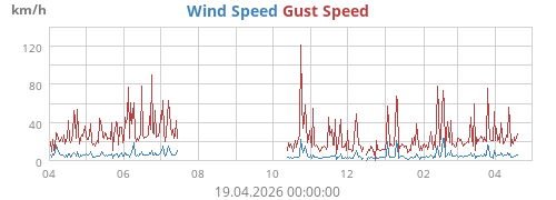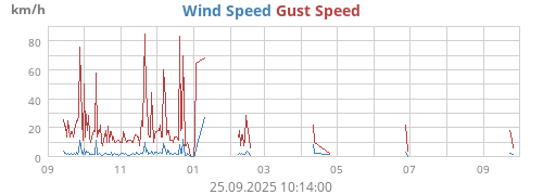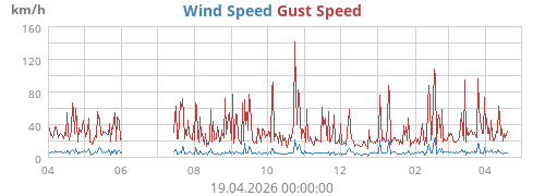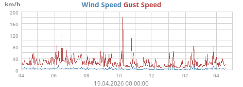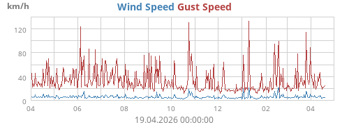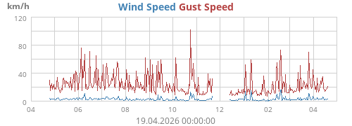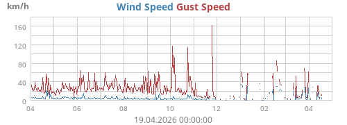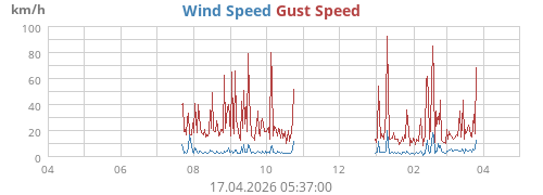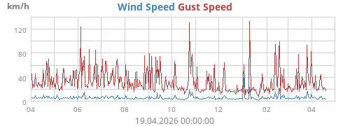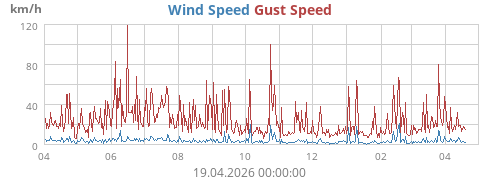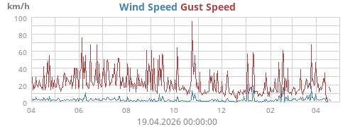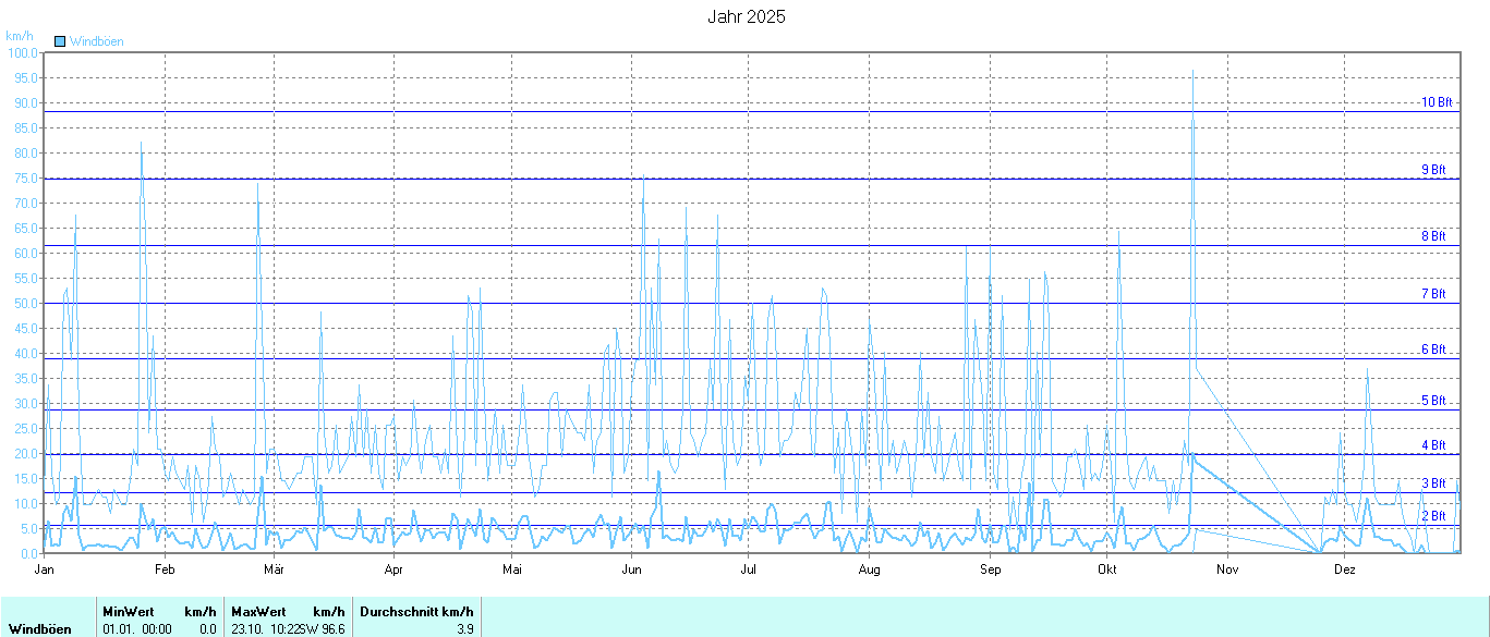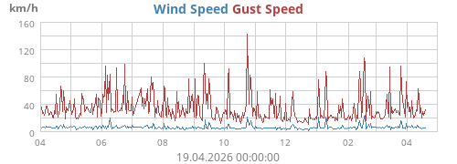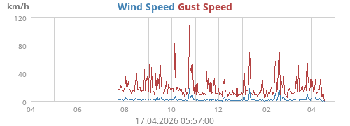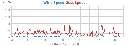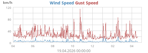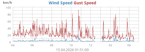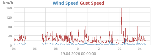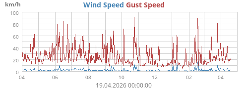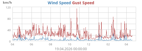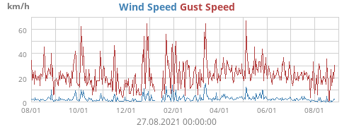 Aufgrund des langen Messintervalls und/oder der Messkurve der VP2 Stationen werden die Windböen meistens 10-20% zu niedrig aufgezeichnet (ausser Windrichtung SSO-SSW), vor allem bei geringen Aufstellhöhen. Daher wird die Windgeschwindigkeit zusätzlich mit einem genaueren, unabhängigen